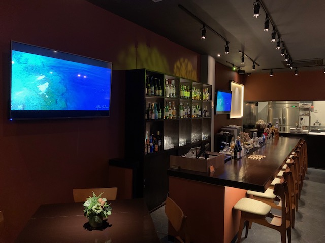 26坪32席のお店で、通常は55インチモニター3台にBGVとして沖縄の離島をドローンで撮った映像を、ユーチューバーさん許可を取って流しています。音響はBOSE社のFS2CBシーリングスピーカー4台と、FS2SEB4台で、ワイヤレスマイク3本+有線マイク等で、披露宴二次会やライブ開催も可能になっています。照明は全て位相制御の調光式LED器具でスペックしており、Panasonicのリビングライコンで調光が一括制御出来ます。また、壁の琉球石灰岩や造花の間接照明も内装デザインと合わせて行いました。