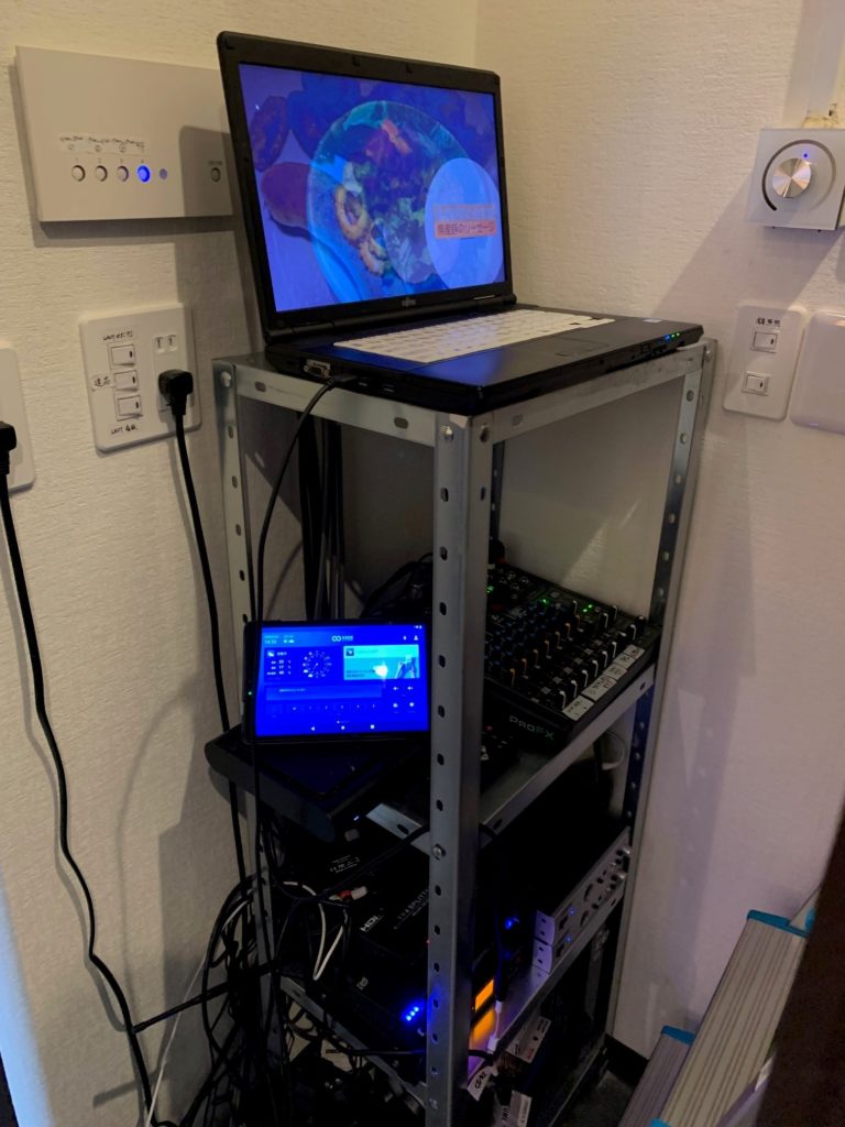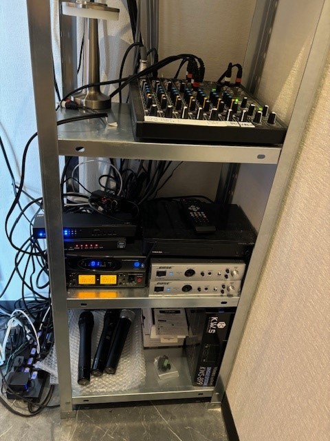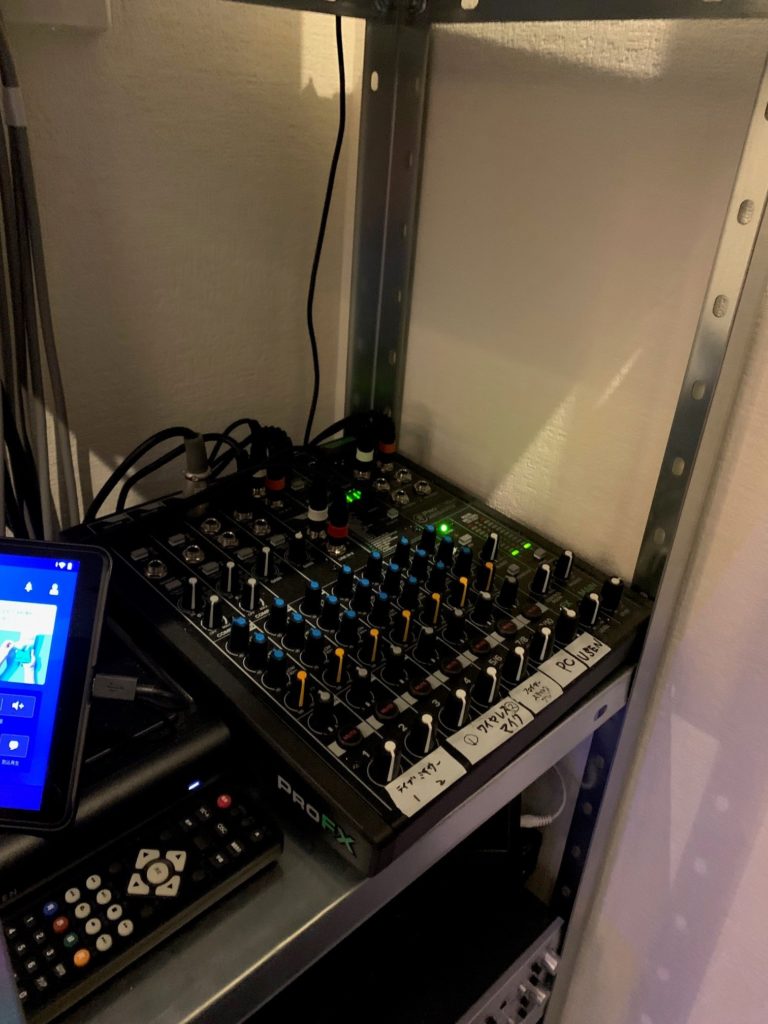 12chアナログミキサー1台、2chワイヤレスチューナー1台、1chワイヤレスチューナー1台、アンプ2台、HDMIセレクター1台、HDMI分配器1台、音声分離器1台、BDプレーヤー1台、Googleクロームキャスト1台、PC1台等