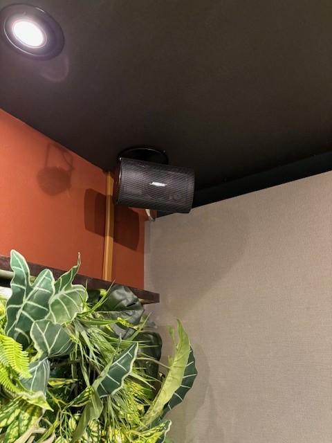 スピーカーはBOSE FS2SEB4台+FS2CB4台で約20坪のフロアとカウンターをカバーしています。アンプはBOSE IZA250-LZ2台でそれぞれを鳴らしています。ワイヤレスマイクは3本使用が可能で、有線マイクのマイク回線も倉庫と店内に2回線出しているので、サブミキサーを置けばライブも可能です。