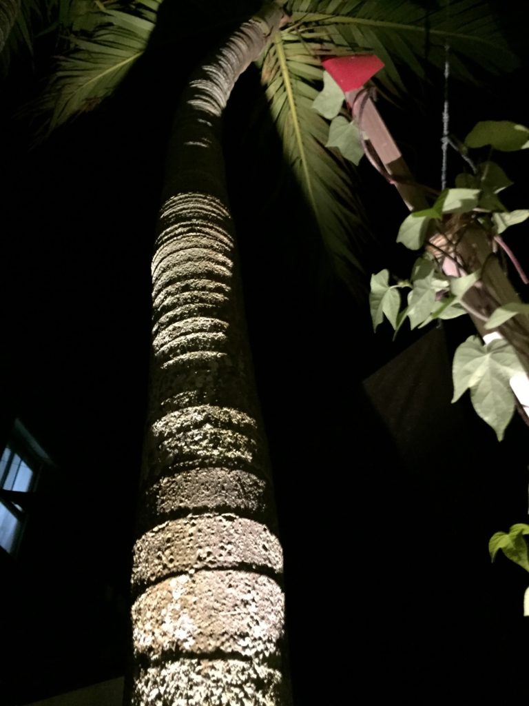 中庭デッキに大きく茂るパームツリーを小型LEDスポットでライトアップしました。